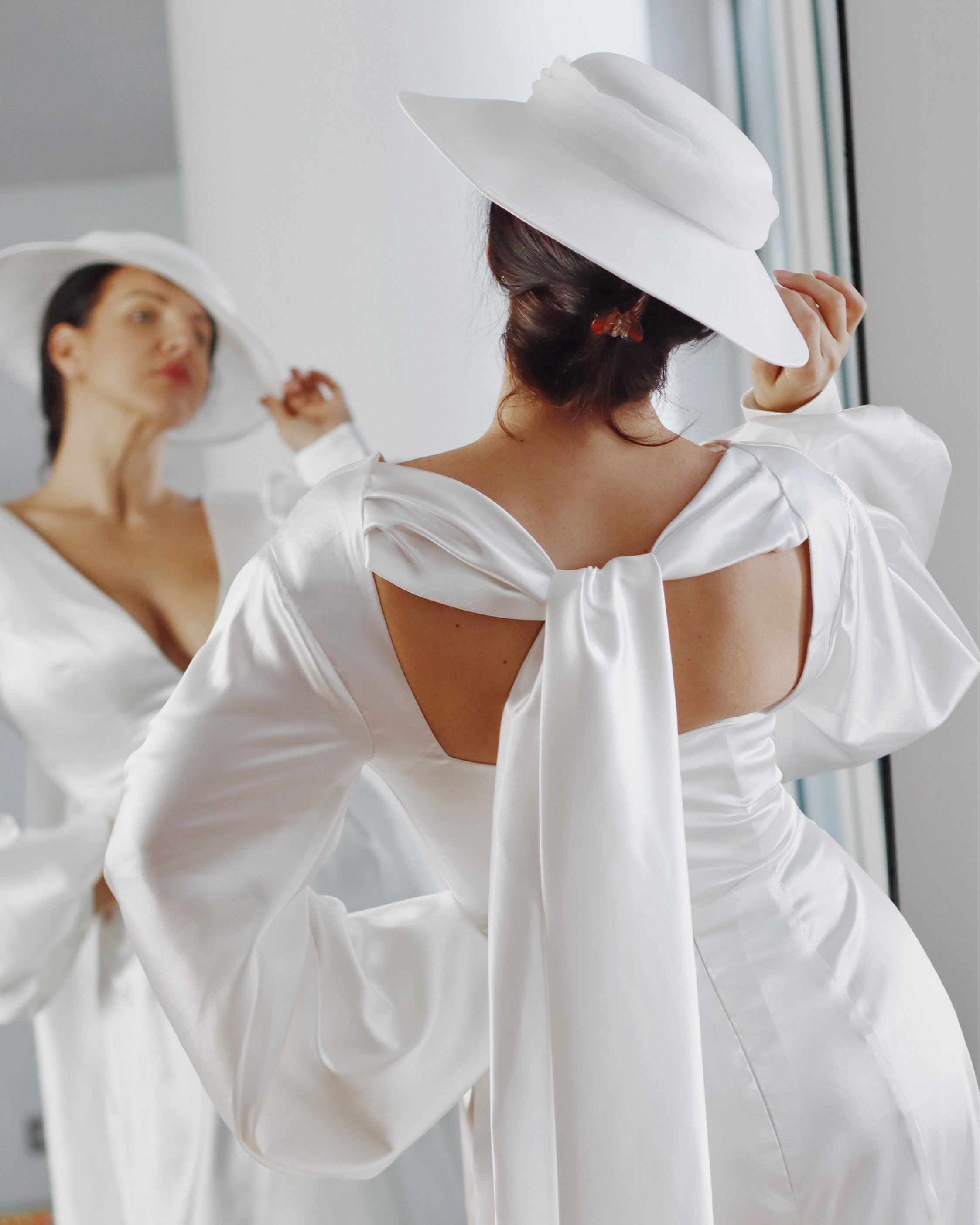 This satin bridal hat with tulle ribbon is the ultimate statement piece for brides who dare to be unforgettable.