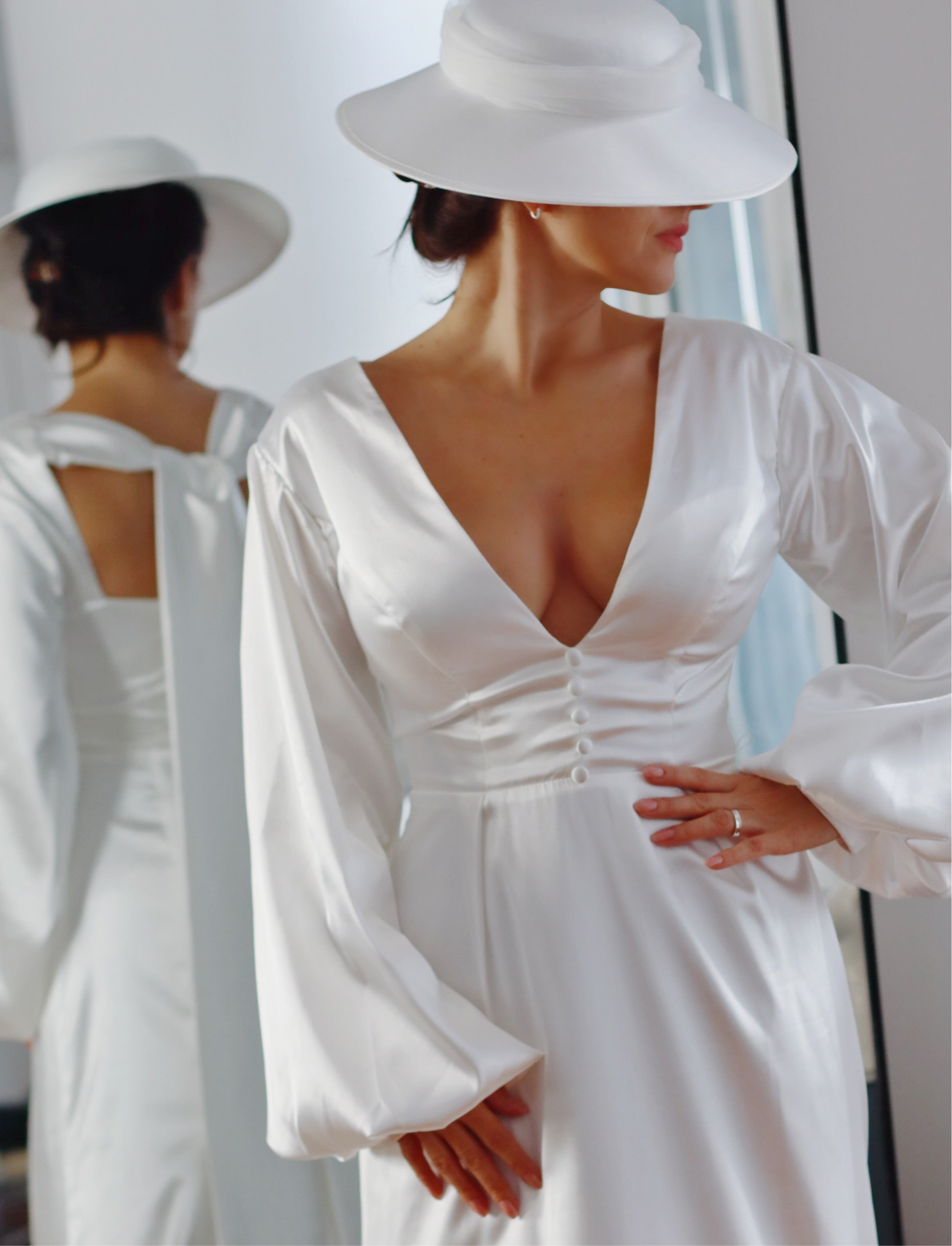 Complete your bridal look with our Satin Bridal Hat, a modern yet timeless accessory for the fashion-forward bride. Made from smooth satin and finished with a soft tulle ribbon, this piece adds a touch of romance and sophistication to your wedding day style.