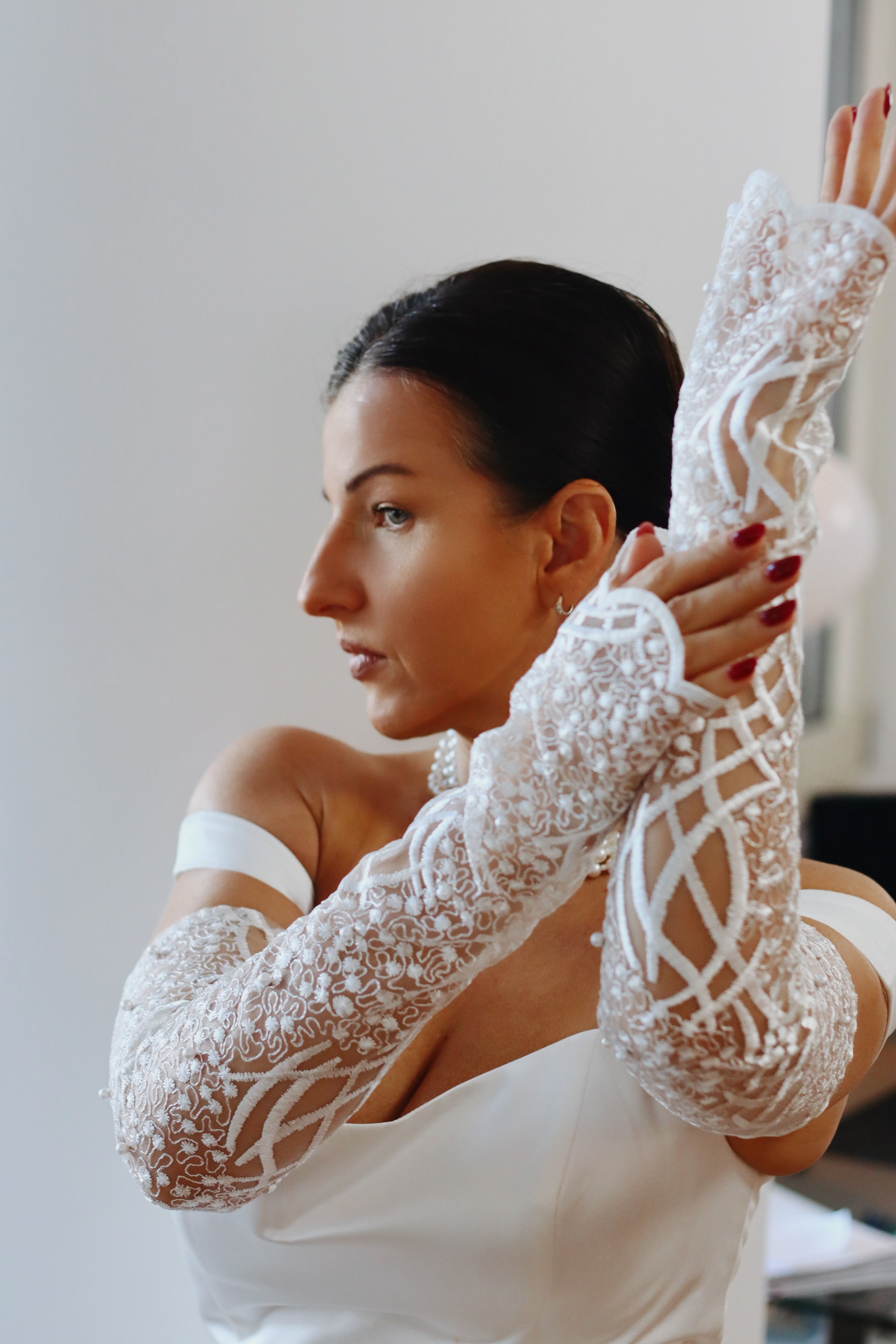 Enhance your bridal style with these exquisite pearl-adorned lace gloves—perfect for the modern romantic bride.