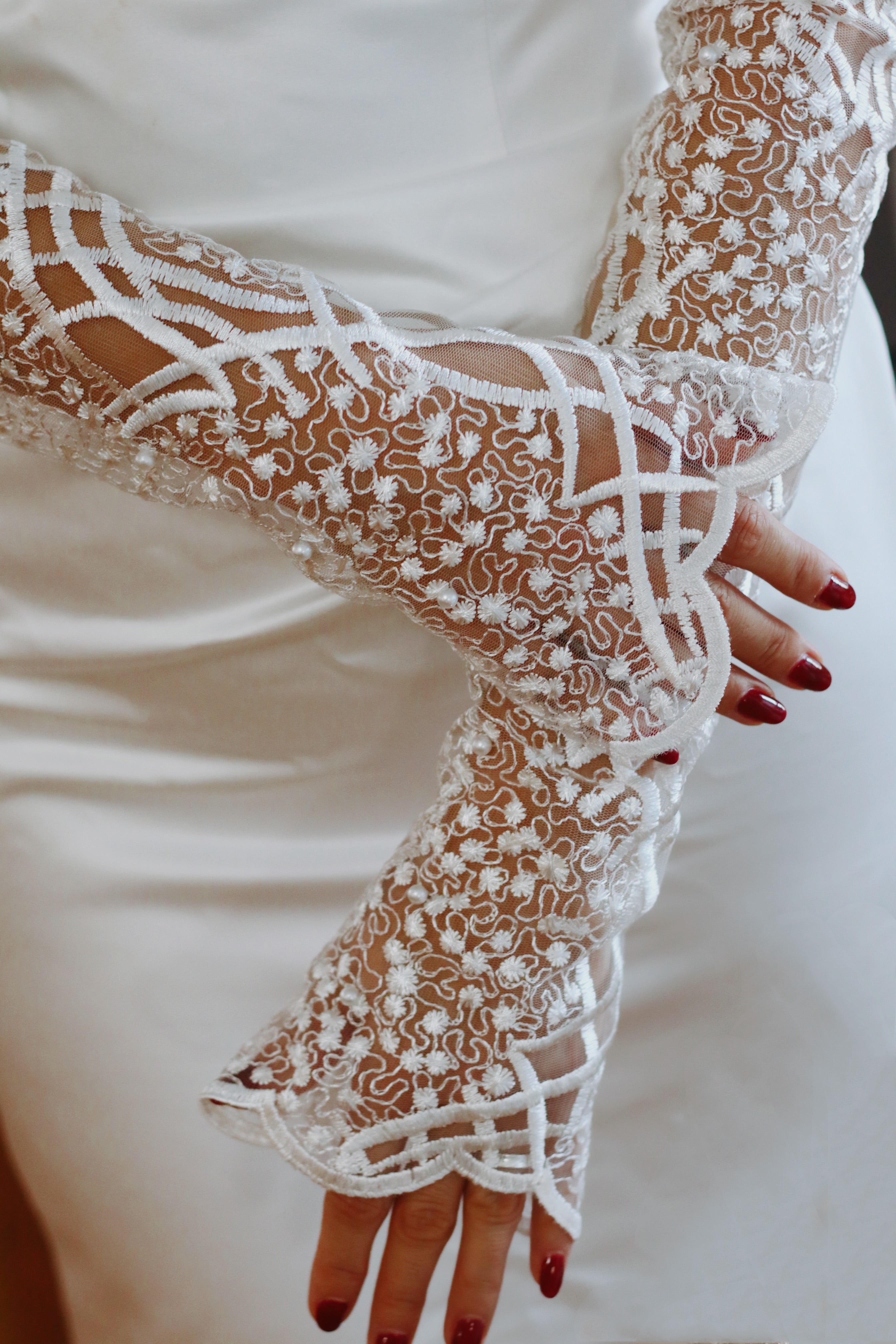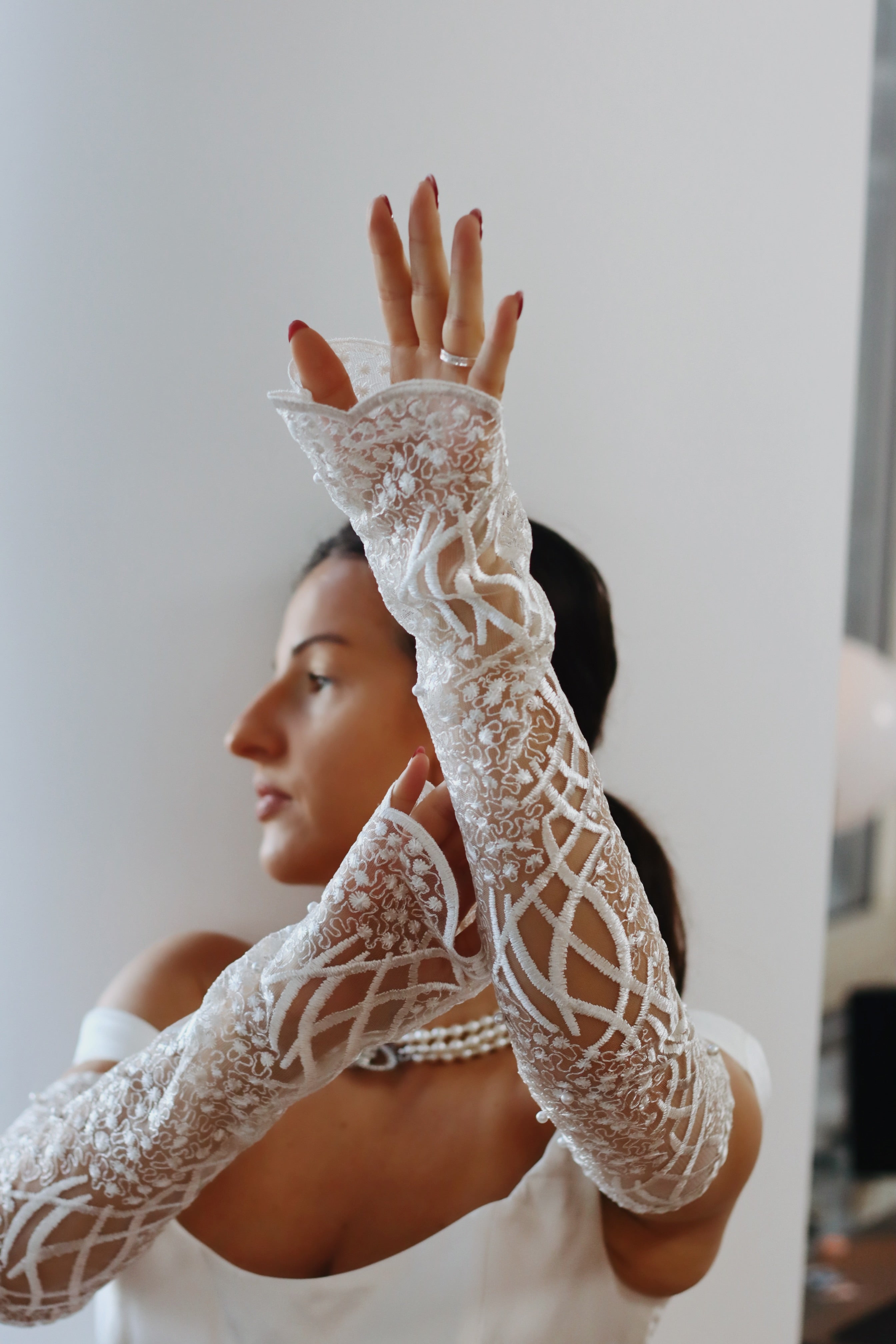 The fingerless design provides comfort and effortless movement while creating an elongated, graceful silhouette. Perfect for brides seeking a refined accessory that enhances both minimalist and ornate gowns, these lace wedding gloves deliver an unforgettable finishing touch.