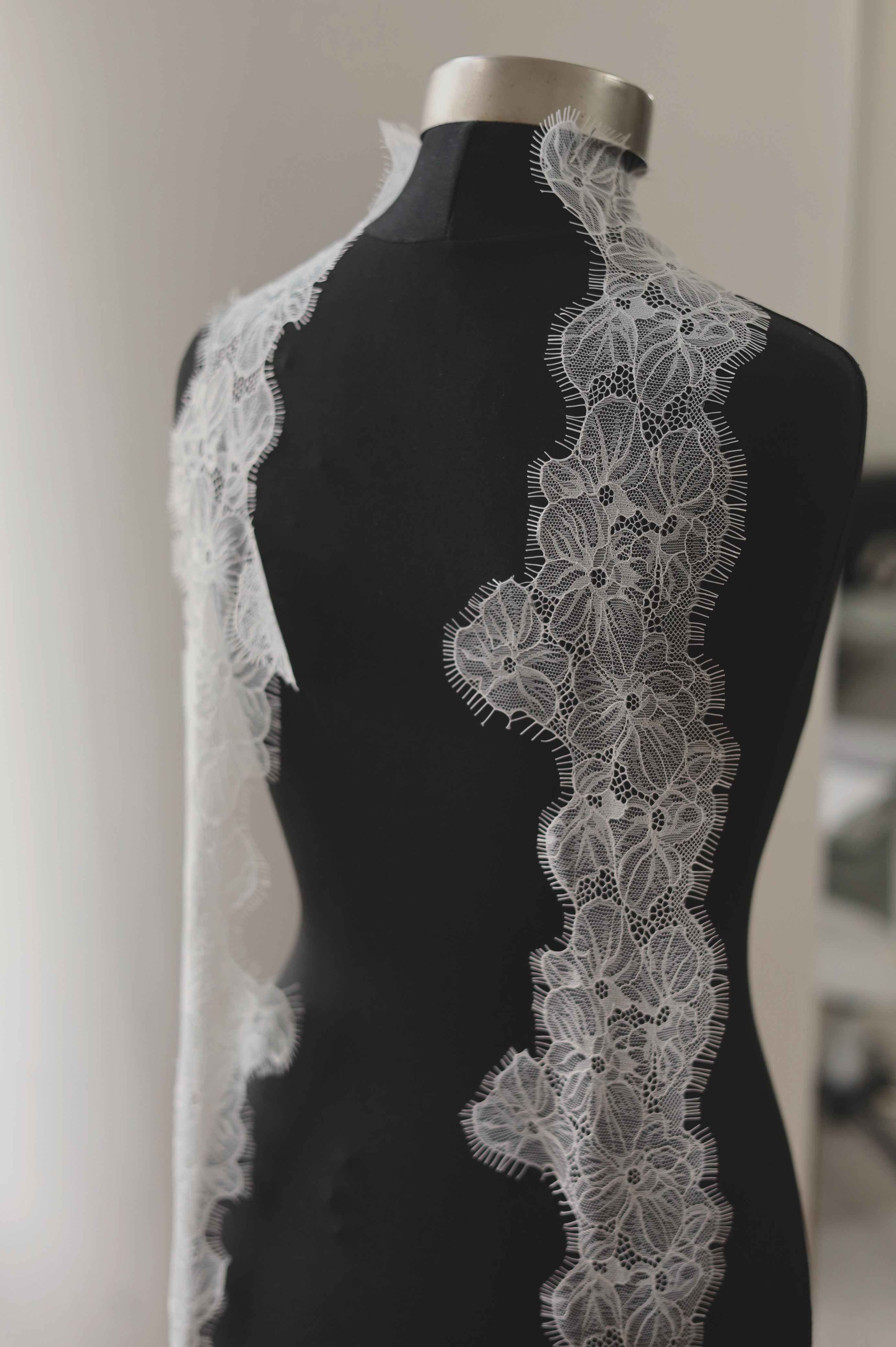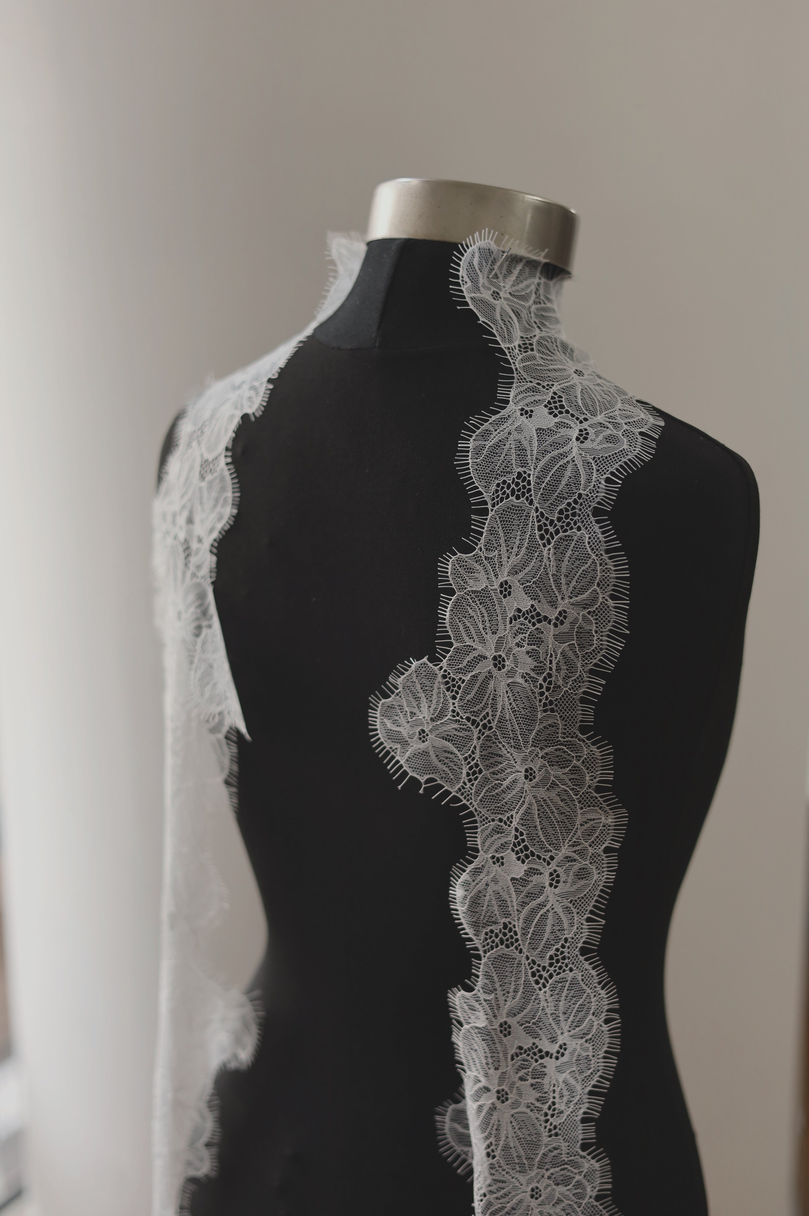 • Material: Fine Chantilly lace with intricate floral detailing